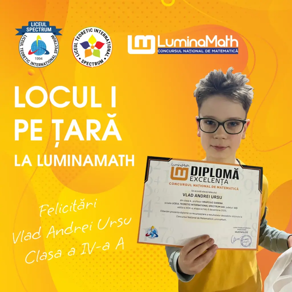 Îl felicităm pe elevul Ursu Vlad Andrei, din clasa a IV-a A, pentru obținerea Premiului I la nivel național la concursul LuminaMath, ediția XXIX.
